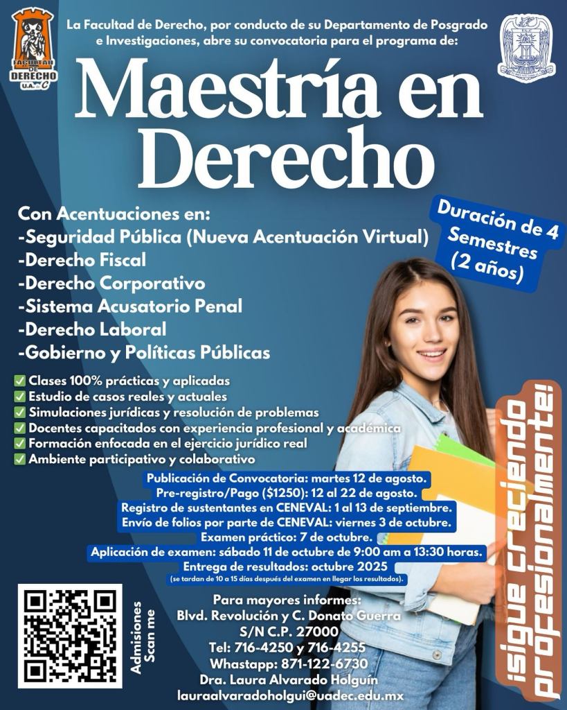 Con esta nueva Maestría en Seguridad Pública, la Facultad de Derecho de la UAdeC refuerza su posición como referente regional en la formación de especialistas en las áreas jurídicas y gubernamentales más relevantes para el país.